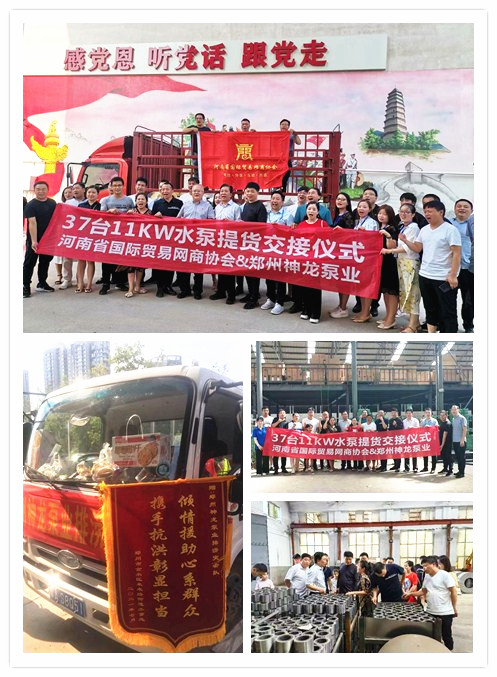 河南國際貿(mào)易網(wǎng)商協(xié)會、神龍泵業(yè)水泵提貨交接,未來路街道贈神龍排澇突擊隊錦旗