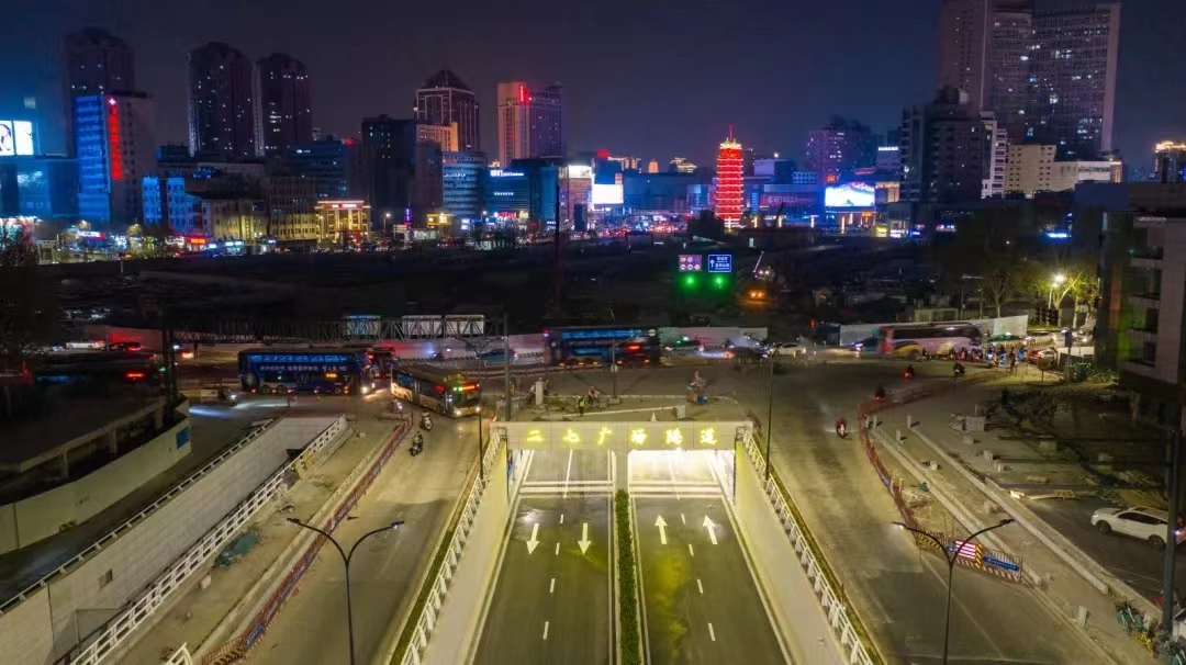 鄭州二七廣場隧道位于二七核心區(qū)重要交通咽喉,主線隧道由西向東依次上跨地鐵一號(hào)線隧道、德華地下商業(yè)街、地鐵三號(hào)線隧道,是目前鄭州市最難開挖的隧道。隧道總長1370米,投資6.2億,于2020年10月16日開工建設(shè),2023年3月11日11點(diǎn)正式通車,歷時(shí)2年。